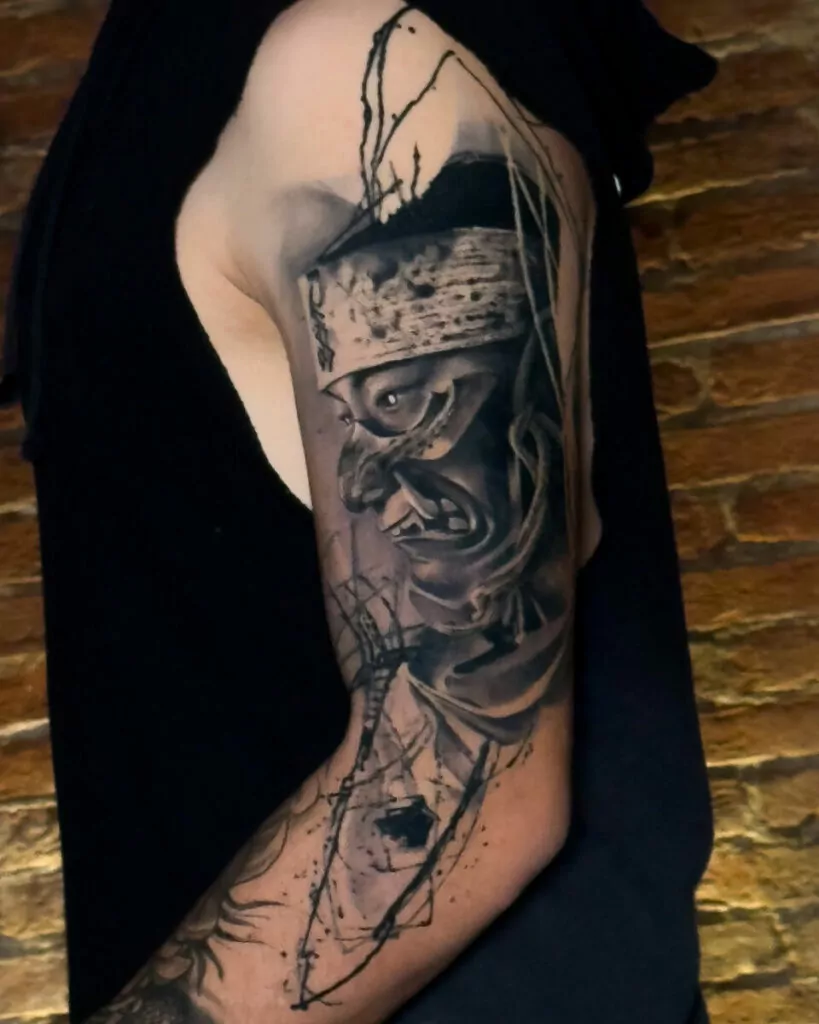 Sulla spalla o sul braccio, invece, una maschera Oni o un Tengu diventano compagni visibili di forza e protezione.